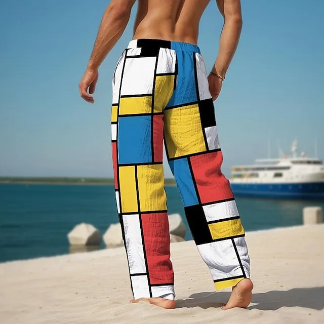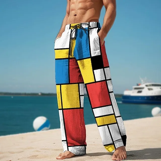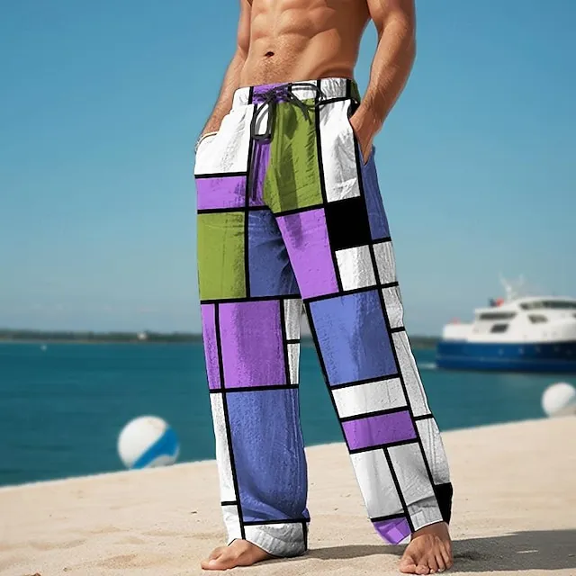 Plaid Color Block Men’s Resort 3D Printed Casual Pants Trousers Elastic Waist Drawstring Loose Fit Straight-Leg Summer Beach Pants S TO 3XL