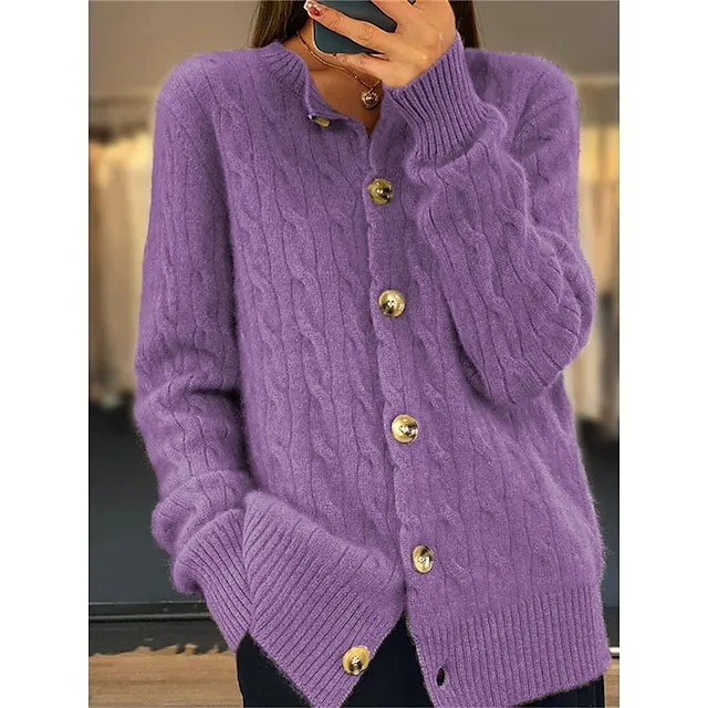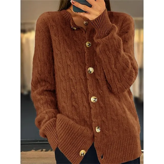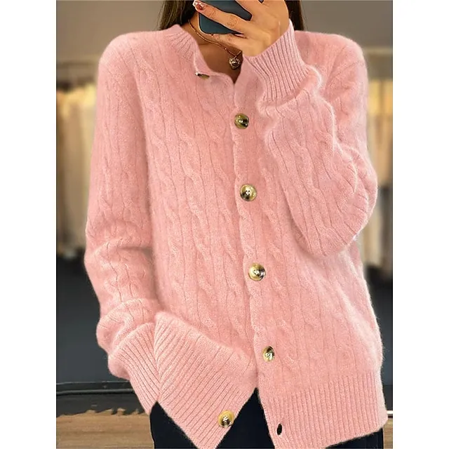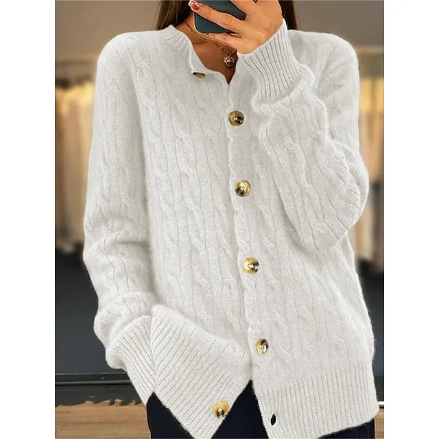 Women’s Cardigan Crew Neck Cable Knit Acrylic Button Knitted Fall Winter Regular Outdoor Daily Going out Fashion Streetwear Casual Long Sleeve Solid Color White Pink Camel S M L