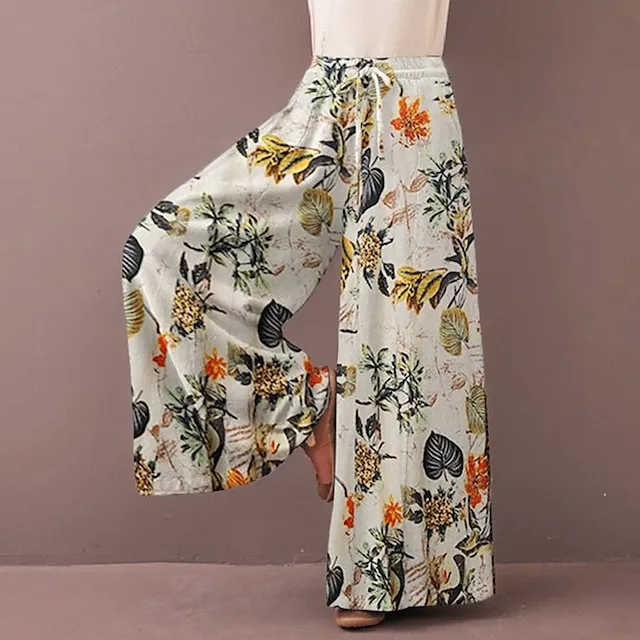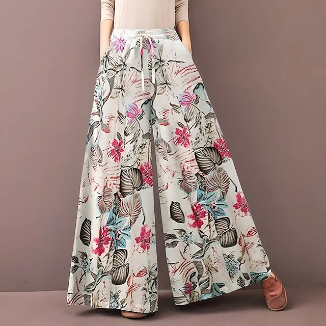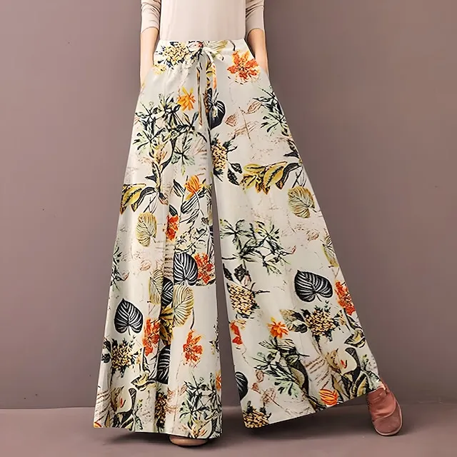 Women’s Culottes Wide Leg Wide Leg Pants Trousers Flower / Floral Side Pockets Baggy Full Length Mid Waist Fashion Casual Weekend Yellow Red S M Summer Spring & Fall