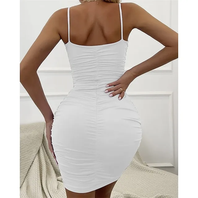 Women’s Party Dress Bodycon Sheath Dress Mini Dress Black White Wine Sleeveless Pure Color Ruched Summer Spring Spaghetti Strap Stylish Slim XS S M L