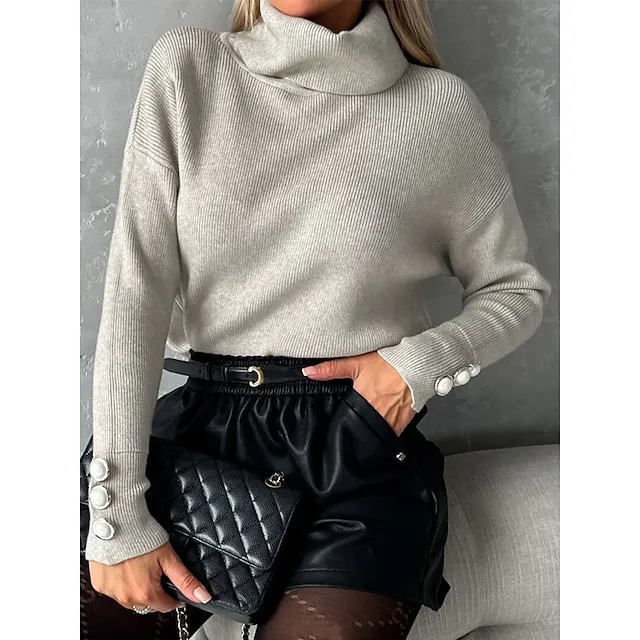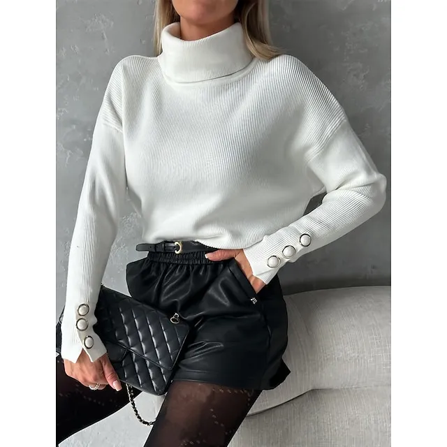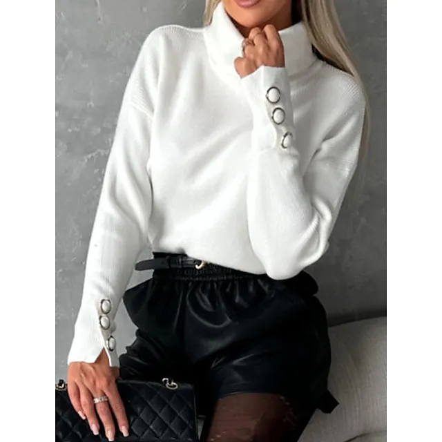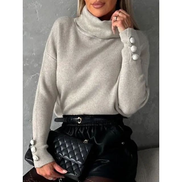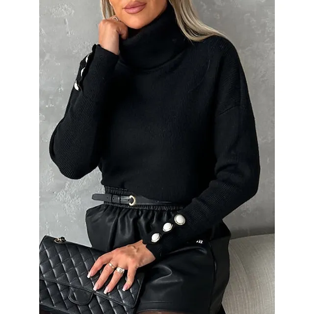 Women’s Pullover Sweater Jumper Turtleneck Ribbed Knit Polyester Button Knitted Fall Winter Regular Outdoor Daily Going out Stylish Casual Soft Long Sleeve Solid Color Black White Army Green S M L