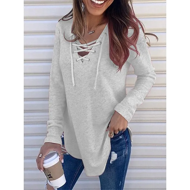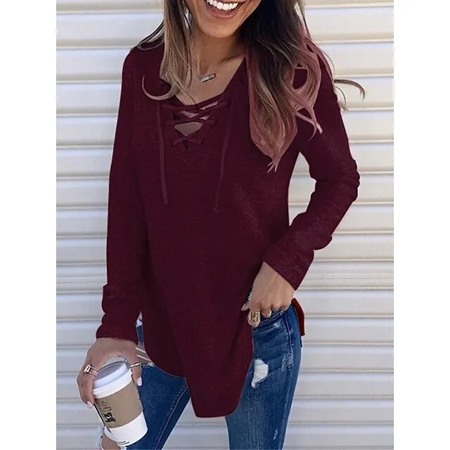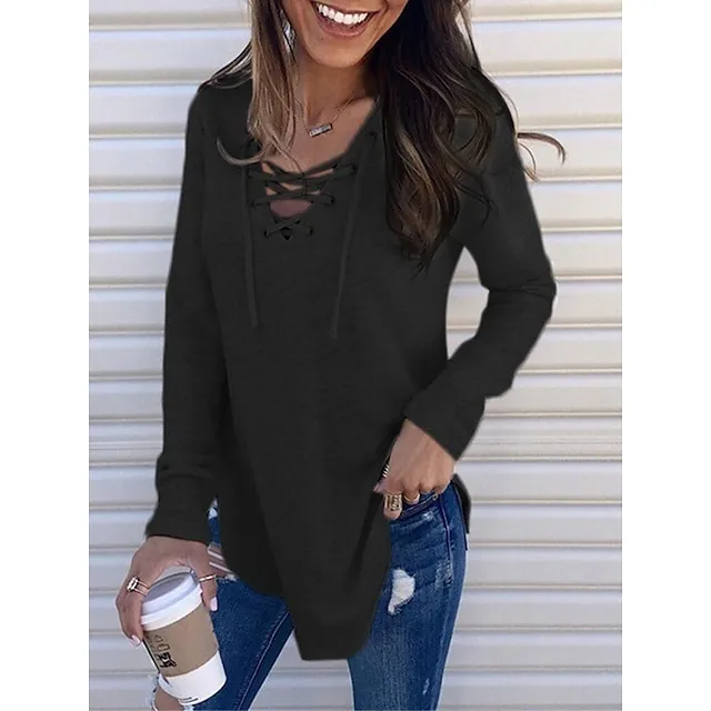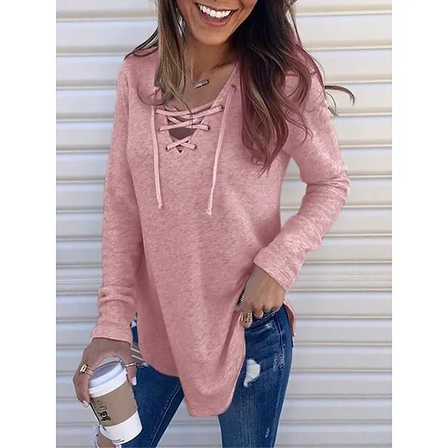 Women’s Pullover Sweater Jumper V Neck Ribbed Knit Cotton Blend Lace up Summer Fall Outdoor Daily Going out Stylish Casual Soft Long Sleeve Solid Color Maillard Black White Pink S M L