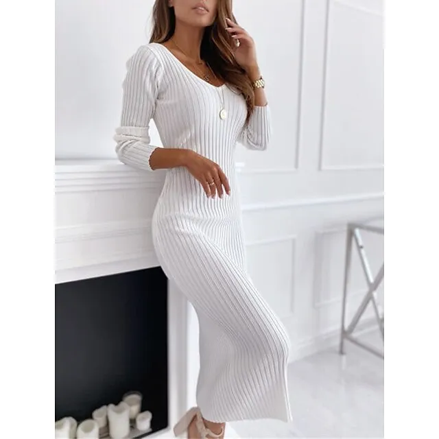 Women’s Sweater Dress Knit Dress Jumper Dress Midi Dress Knitwear Warm Fashion Pure Color Outdoor Casual Daily Going out V Neck Long Sleeve Regular Fit Black White khaki S M L XL XXL