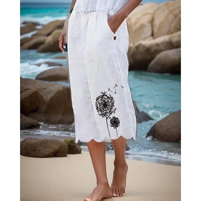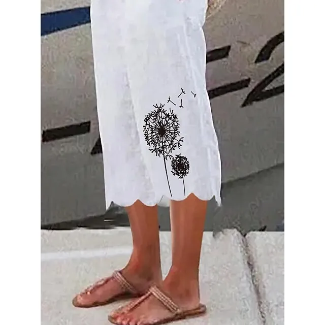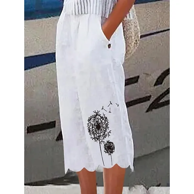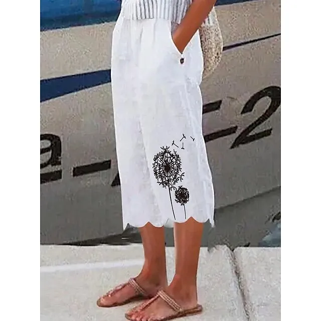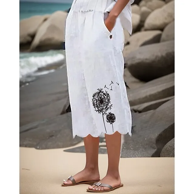Women’s Wide Leg Linen Pants Capri shorts Faux Linen Dandelion Side Pockets Baggy Calf-Length Casual Holiday Weekend White S M