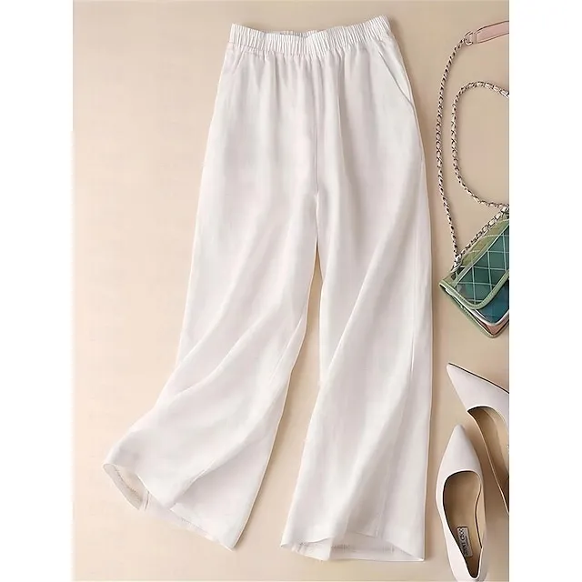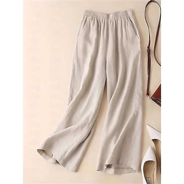 The Wide Leg Chinos Cropped Pants are an essential for fashion-forward comfort Constructed in cotton and linen these high-waisted pants balance between daily casual and streetwear style Perfectly poised for vacation or everyday wear they feature an elastic waist pockets and a simple plain design Comfort is a certainty with their breathable and soft fabric Available in multiple sizes